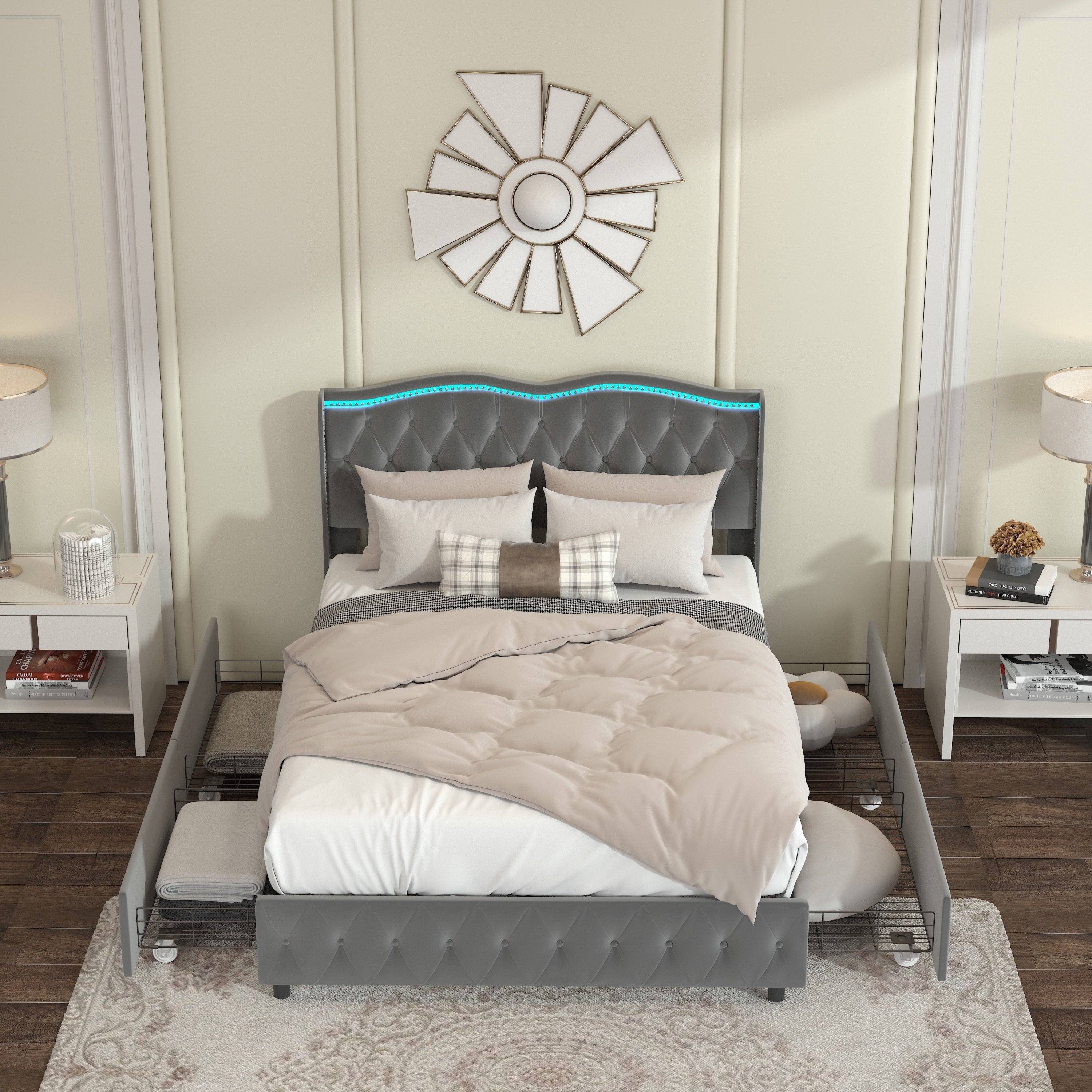 Queen Platform Bed Frame , Velvet Upholstered Bed With Deep Tufted Buttons and Nailhead Trim, Adjustable Colorful LED Li