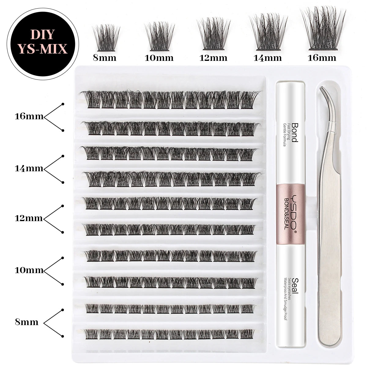 This set includes Fake Eyelashe Clusters, Lash Bond and Seal, Makeup Tools Mix, DIY Lower Lashes Extension Kit, Tweezers, Waterproof False Lashes. These false eyelashes provide long-lasting wear and quick drying time, while also being waterproof and sweat-proof. The set also includes eye black and tweezers for easy application. The bond and seal feature ensures a secure hold.
