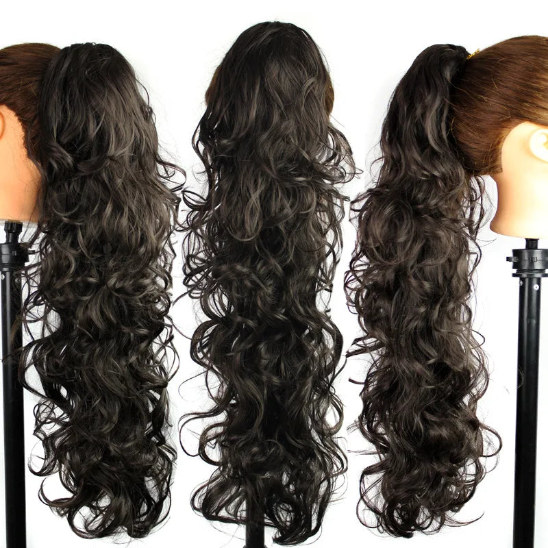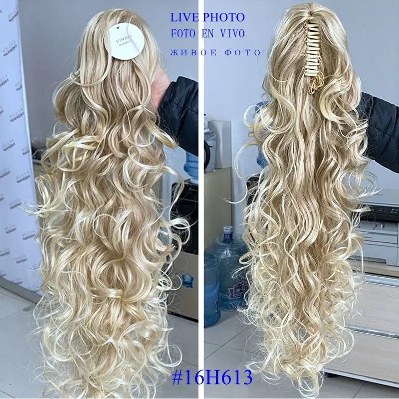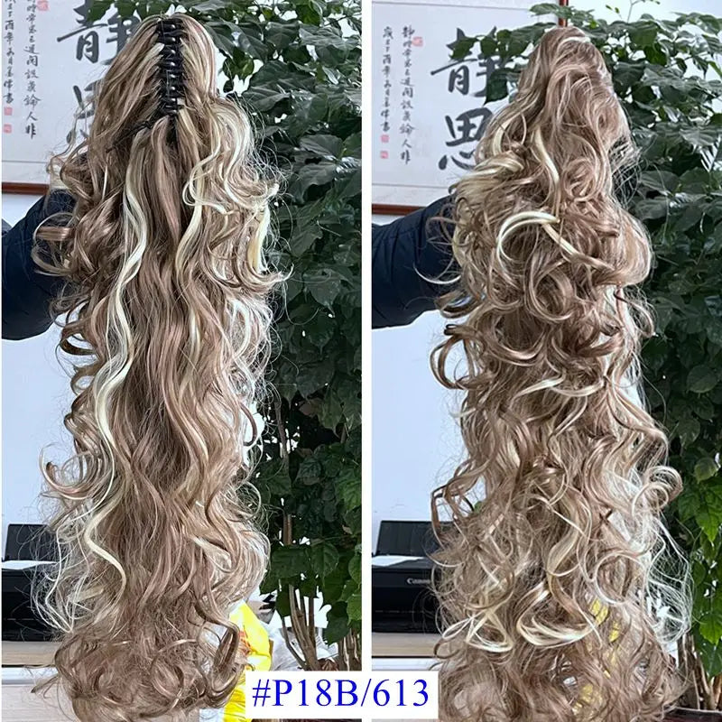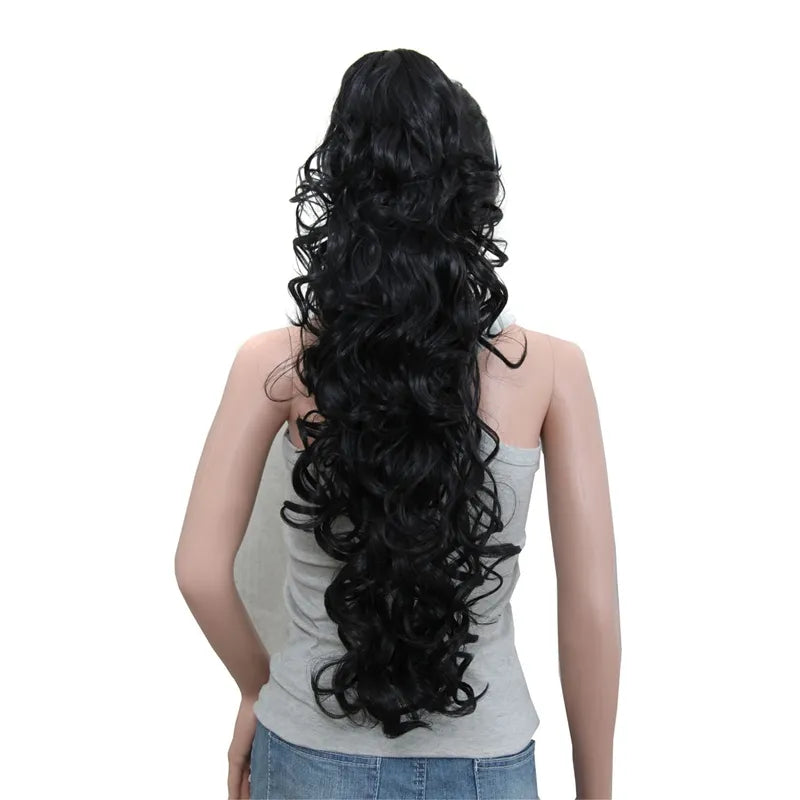 This product, features a 76cm length and weighs 210g, making it a long and voluminous option for braiding. The high temperature fiber material allows for easy styling and a natural appearance. With a unique frosted color type, this ponytail extension is attached with a clip-in for secure and comfortable wear. Each package contains 1 unit weighing 180g, constructed with a wavy texture for a realistic look. This high-quality product is made with durable, high temperature fiber material for long-lasting wear.