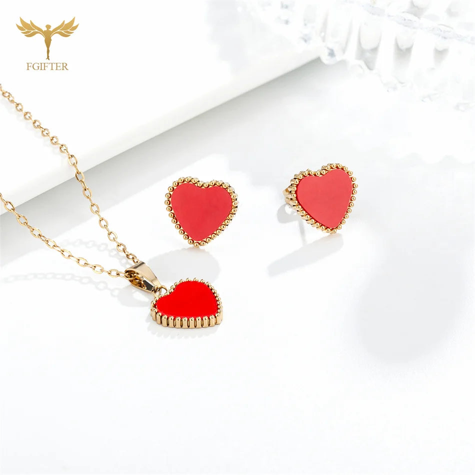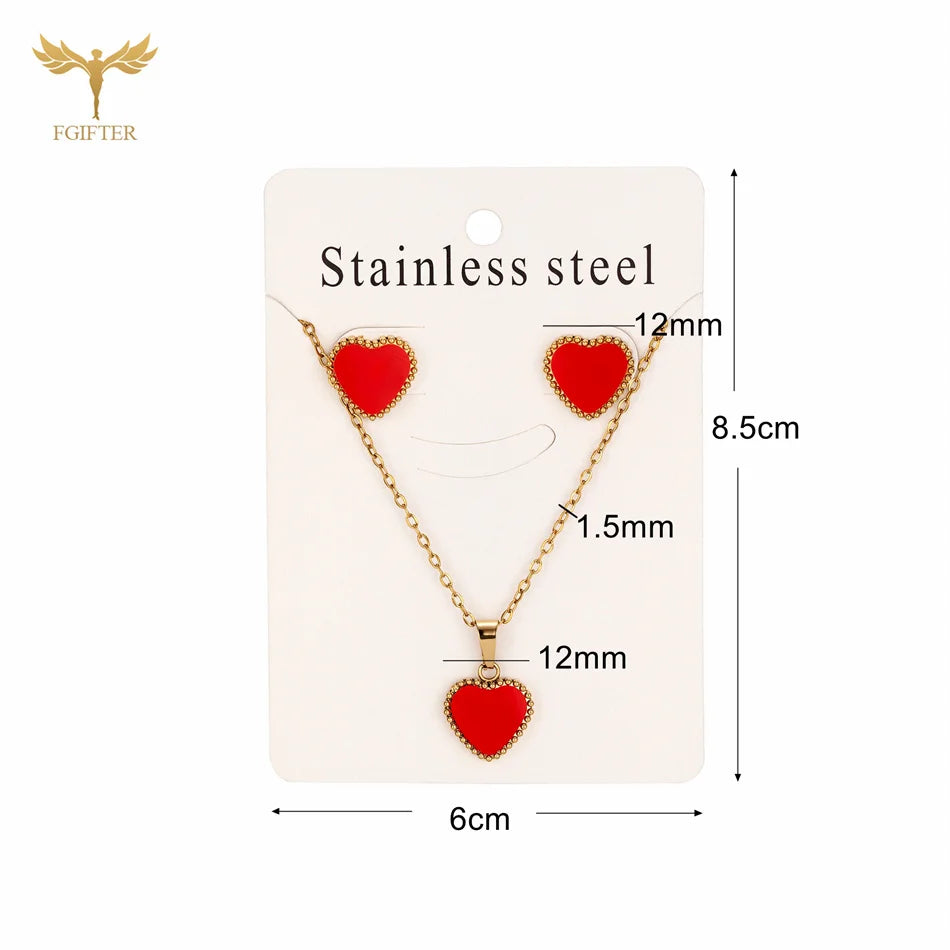 This stunning jewelry set features a beautiful red heart design, perfect for any woman. Made with high-quality golden stainless steel, the set includes stud earrings, a 40cm chain necklace, and an oil drip pendant charm. A thoughtful and elegant gift for any occasion.