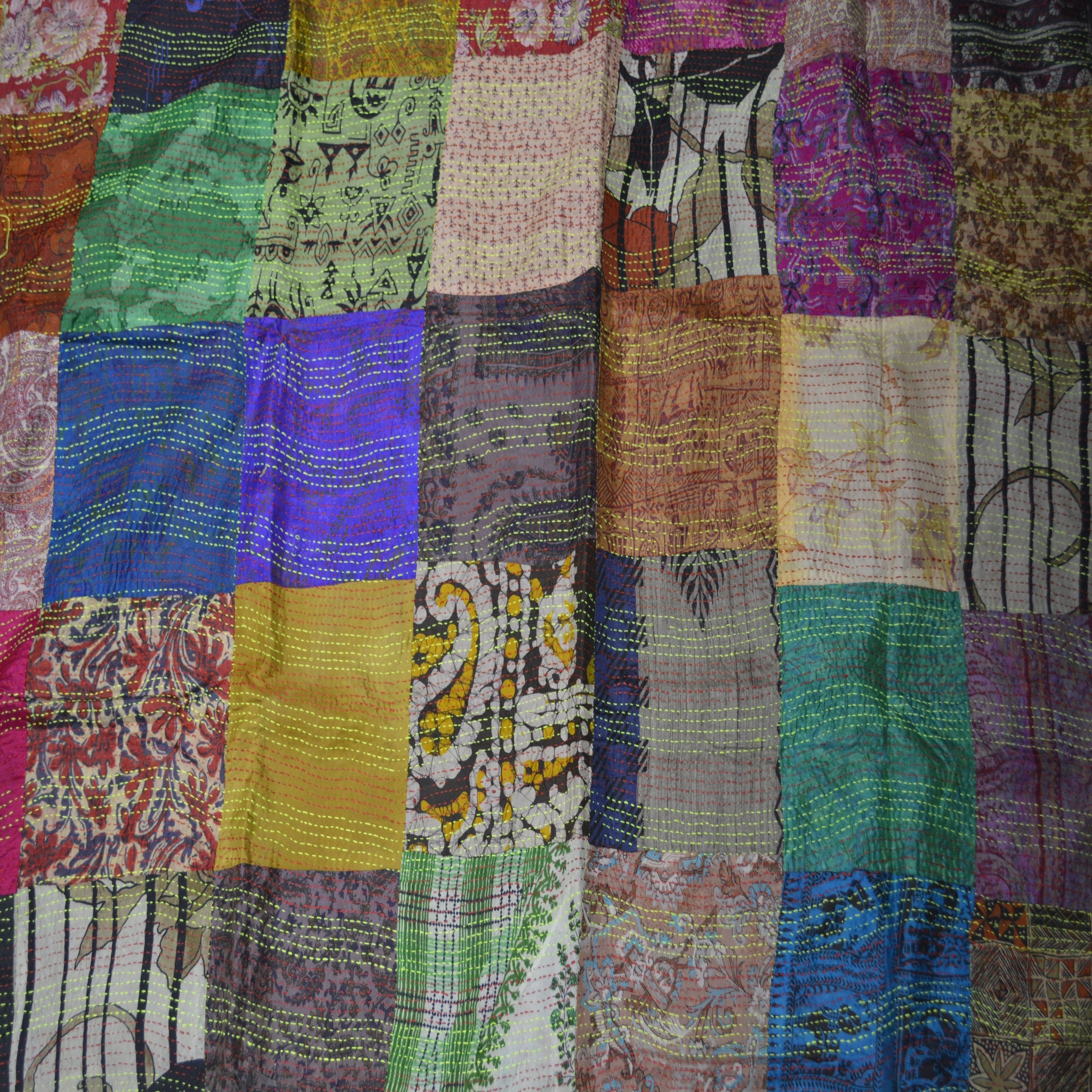 Kantha refers to the type of stitch used in the craft of embroidery. The Kantha stitch gives the sari quilts their general wavy, textured quality. Each Kantha quilt is handmade, fair trade, unique, and has hand-sewn magic and a story of many layers. It can be used in many ways around your home - a throw for a sofa or bed, they can be made into cushions, a wall hanging, a picnic or beach throw, and sewn into a variety of garments or a quilt.