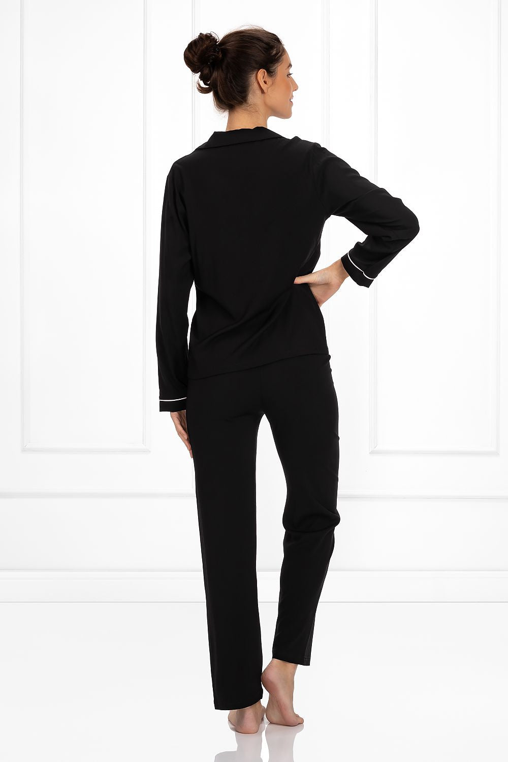 Unbuttoned women's pajamas. Shirt with long sleeves ending in a cuff decorated with piping. Pointed neckline with a padded collar. At the height of the chest a pocket decorated with piping. Complete with long, straight sleeves. At the elastic decorative satin bow. Packed in a bag.