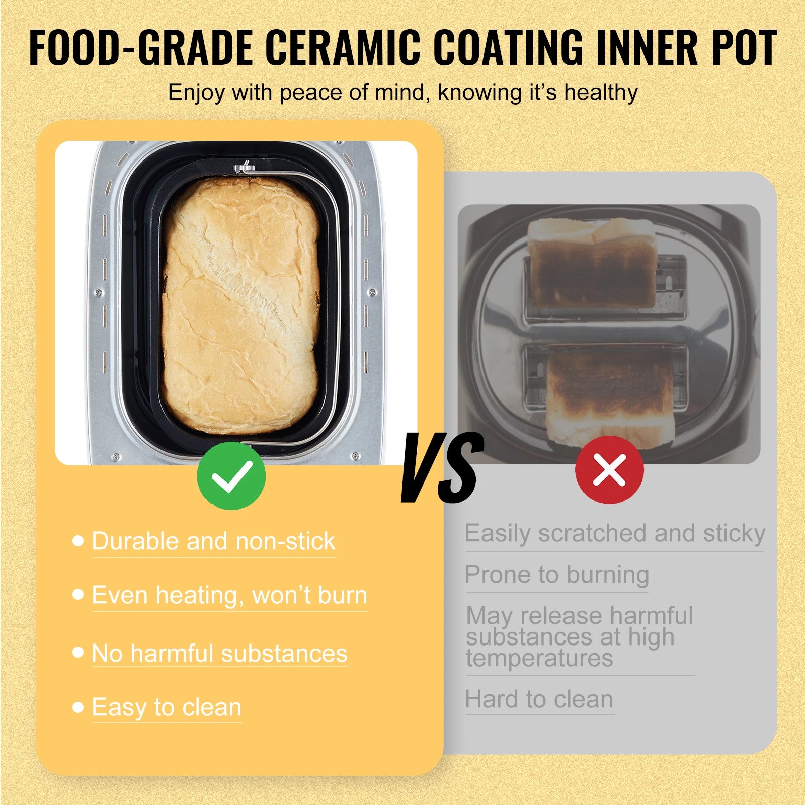 • Health-Conscious Ceramic Inner Pot: Crafted with a durable, food-grade ceramic coating, the bread maker’s inner pot is designed for your safety and health. This non-stick surface resists high temperatures and is free from harmful chemicals, ensuring that every loaf is safe and wholesome. Plus, the Teflon-coated kneading blade further guarantees that your ingredients are mixed without risk of contamination, letting you enjoy delicious, worry-free bread.