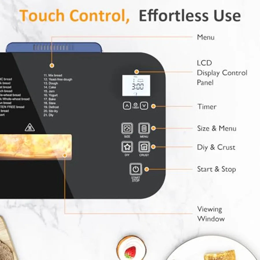 Bake artisan-quality bread at home with this versatile bread maker featuring 21 customizable programs designed for everything from classic loaves to specialty doughs. The 2.2LB capacity accommodates various bread sizes, while three crust color settings let you achieve your preferred finish—from light to dark. A digital touch panel provides intuitive control, and the 15-hour timer enables convenient delayed baking. The keep-warm function maintains optimal temperature after baking concludes. Whether you're crafting whole wheat, gluten-free, or enriched doughs, this machine streamlines the process with precision timing and consistent results, making fresh bread accessible to both novice and experienced bakers.