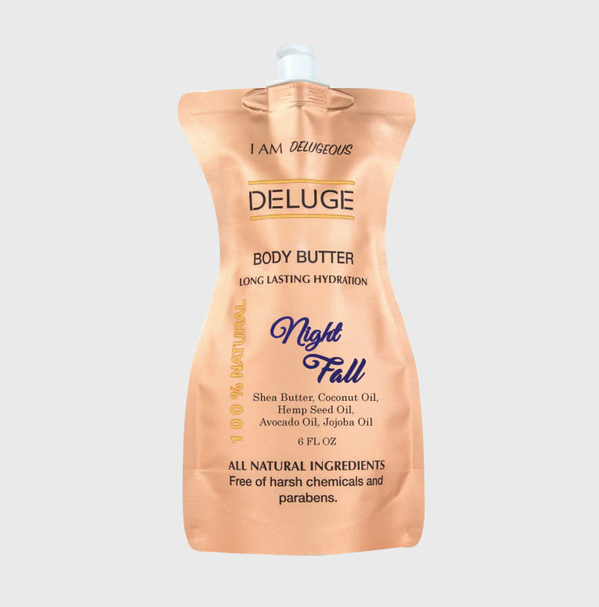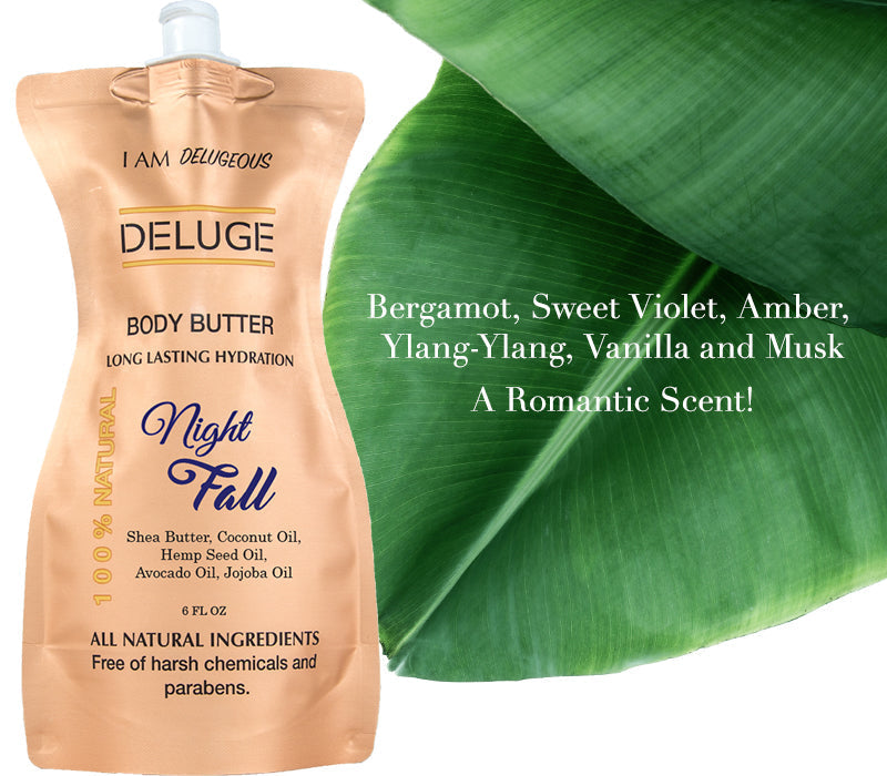 Our Deluge Body Butter Night Fall have a combination of ingredients that provide a dose of extra moisture to help maintain the natural and optimal levels of hydration, without modifying or altering the cellular structure of the dermis, and also provides other benefits thanks to the natural oils and butters such as Shea Butter, coconut oil, hemp seed oil, avocado oil and jojoba oil which provide essential natural vitamins such as A, B, E, K, Omega 3 and 6. Our Body butters are Composed of 100% pure natural ingredients and have been created to care for and protect any skin type. No matter the type of dermis you have, our butters are suitable for all skin types and ages: normal, mixed, fat, dry or sensitive, and is suitable for both men and women. Deluge Butters enhances cellular regeneration, so in addition to providing water, it contributes to the skin improving the appearance, maintains firmness, reduces marks and scars and recovers brightness and luminosity. Deluge Body Butter forms a protective barrier between the skin and the elements. This traps moisture in, keeping irritants out. It keeps the skin hydrated all day. It performs double the duty when it comes to skin hydration.