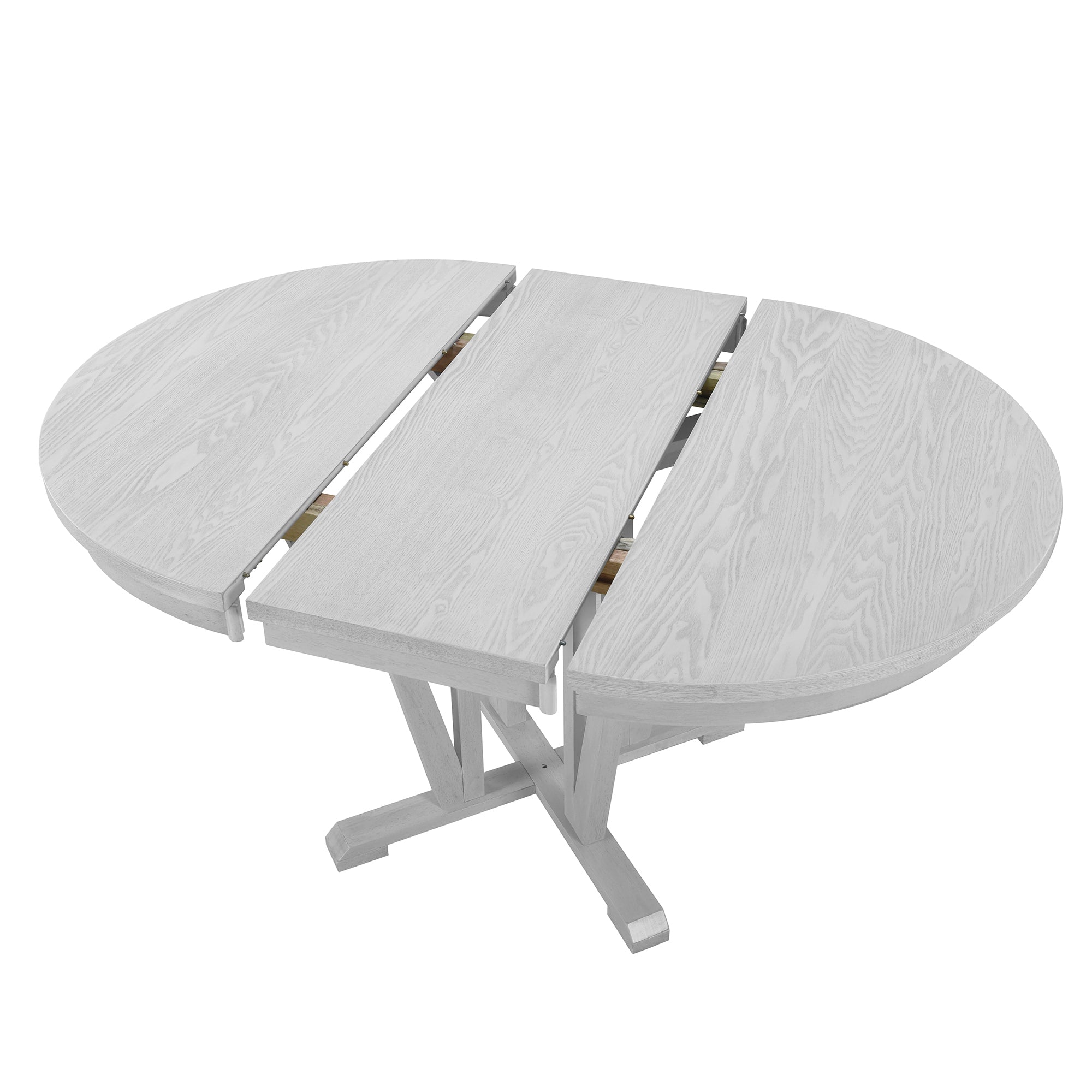 • [5-piece Dining Table Set] This 5-piece dining table set exudes elegance with its round tabletop and distinctive trestle-based legs, creating a refined and inviting atmosphere. The graceful gray wood texture adorns both the tabletop and four cross-back dining chairs, making it a perfect fit for farmhouse or modern-style dining rooms. Additionally, the extendable table adds versatility, ensuring suitability for any room size. Experience sophistication and comfort with this versatile dining set