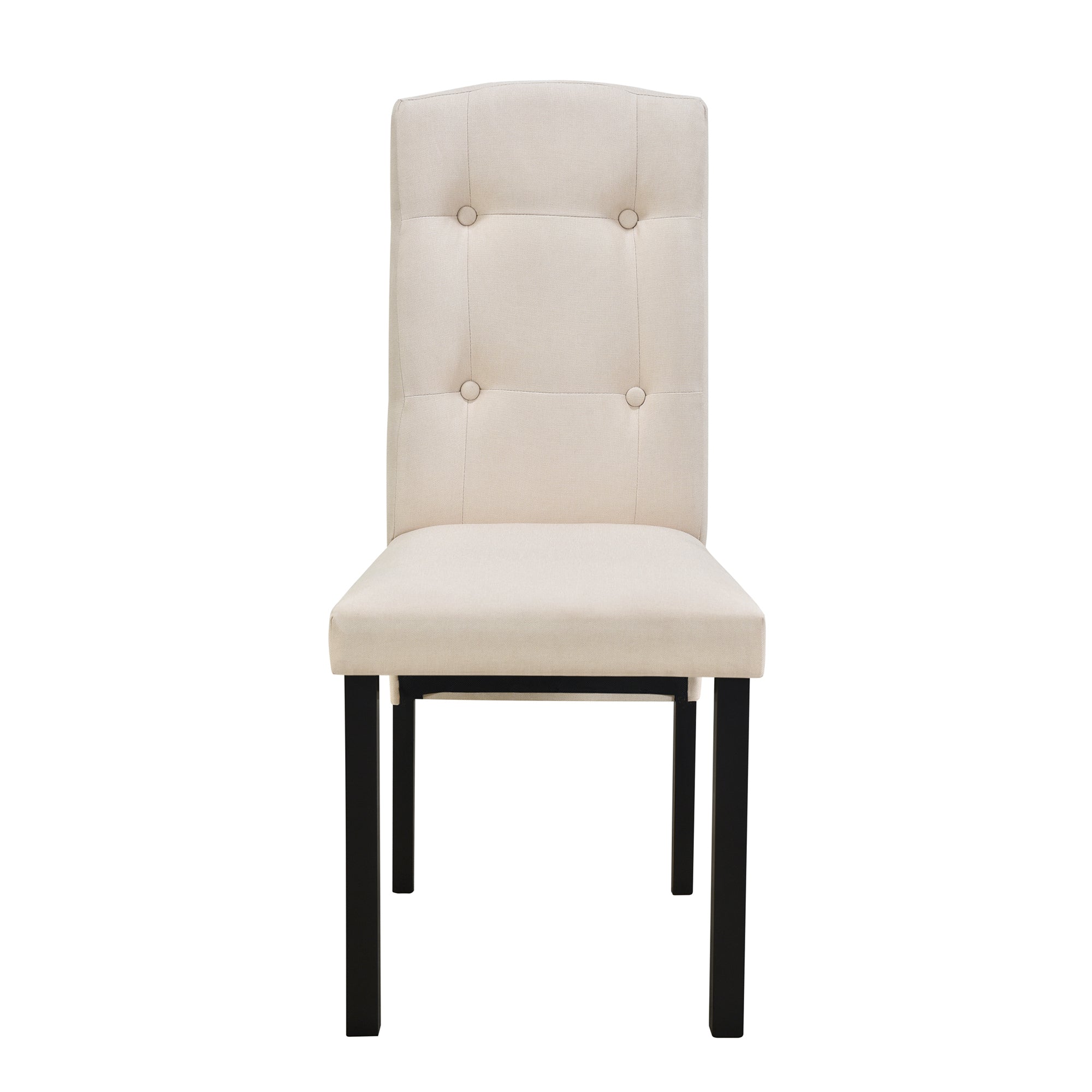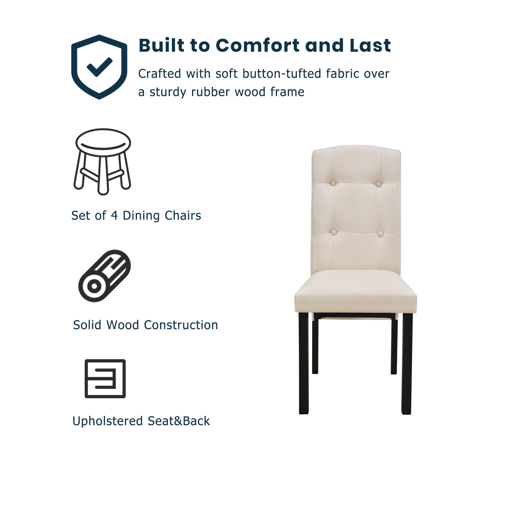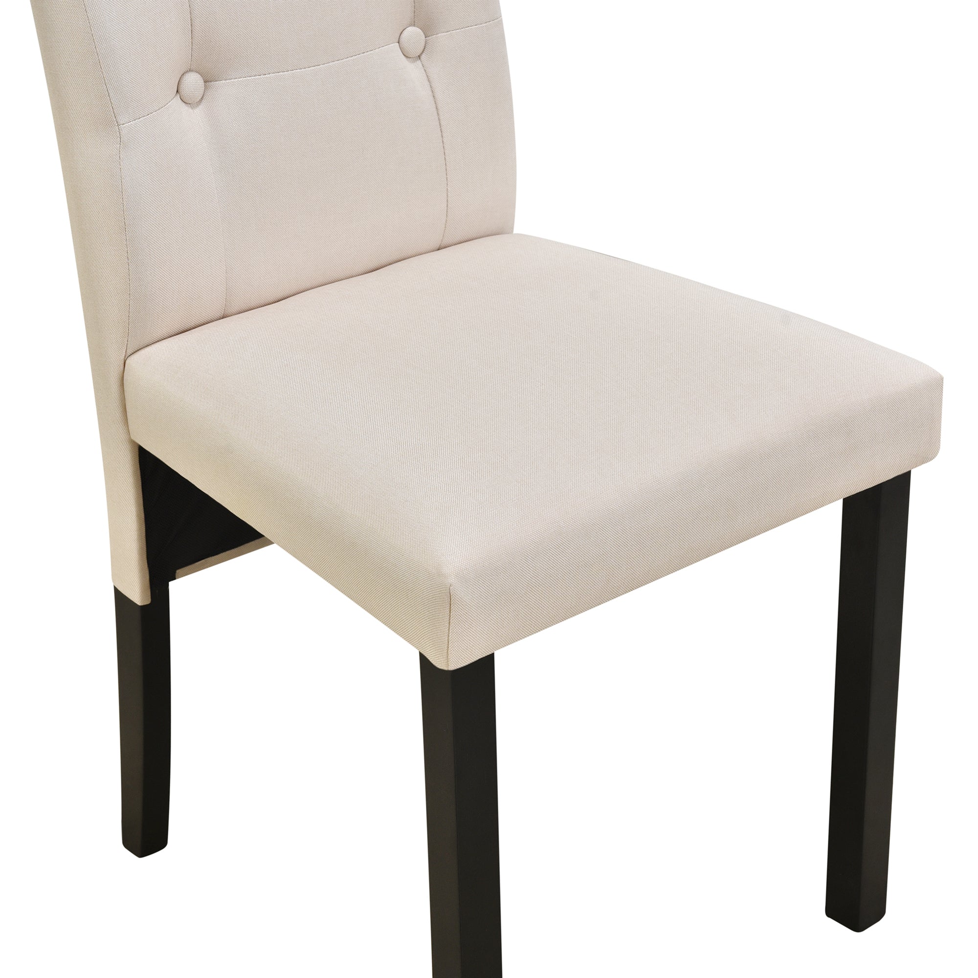 - [Upholstered Dining Chairs] The dining chairs are designed with ergonomic backrests that provide ample support during long meals. Each chair is upholstered with quality fabric that complements the set's overall aesthetic, making your dining experience a luxurious one.The button decoration adds a refined touch of class to the already stylish upholstery, creating a welcoming and inviting ambiance for your guests.