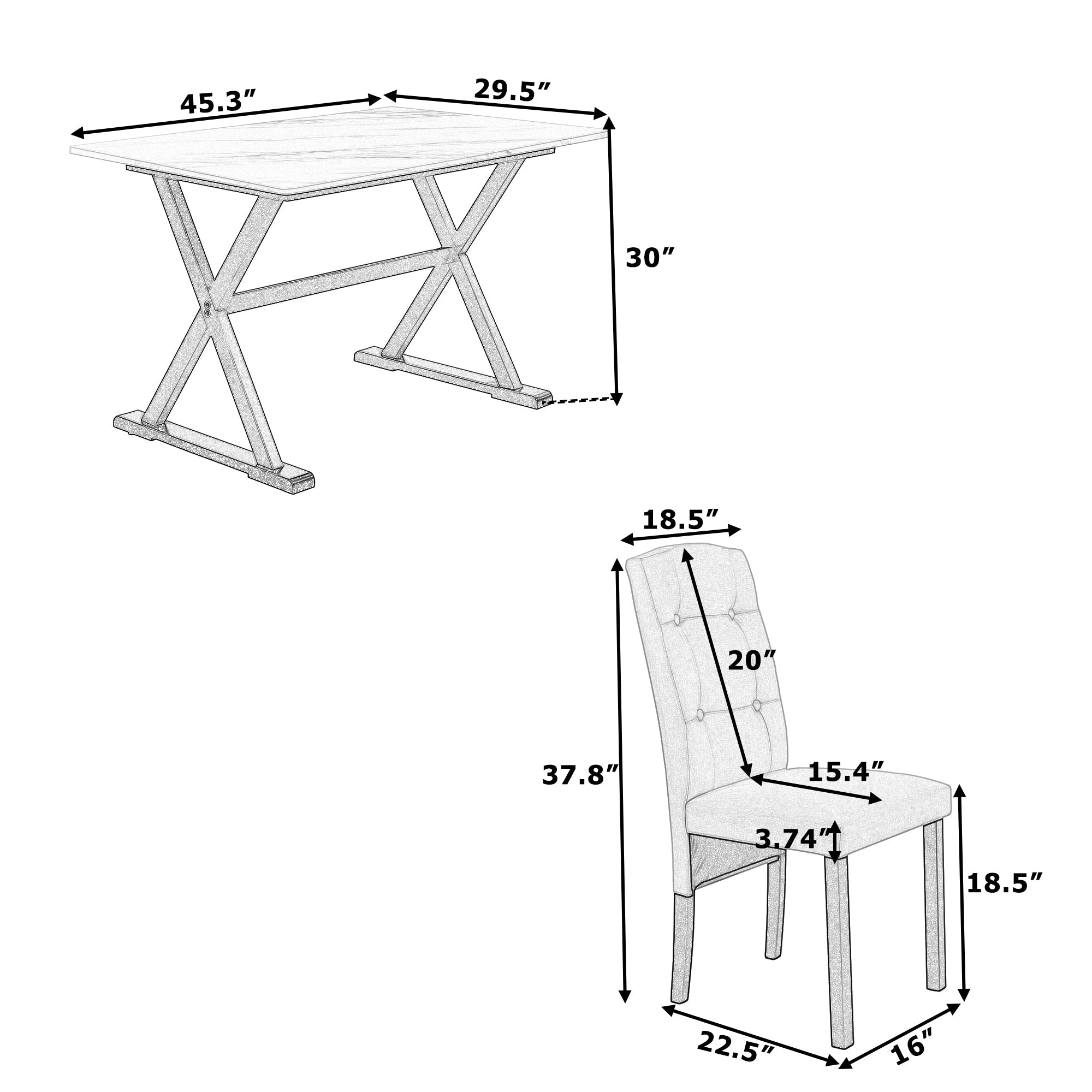 - [Dimensions and Warranty] Dining table:45.3x29.5x30inch(LXWXH);Tabletop thickness:0.7inch;Dining chair:22.5x16x37.8inch(LXWXH), Seat depth:15.4inch; Seat to ground:18.5inch. 2 boxes in total which may not come together. Please feel free to contact us if any issues.