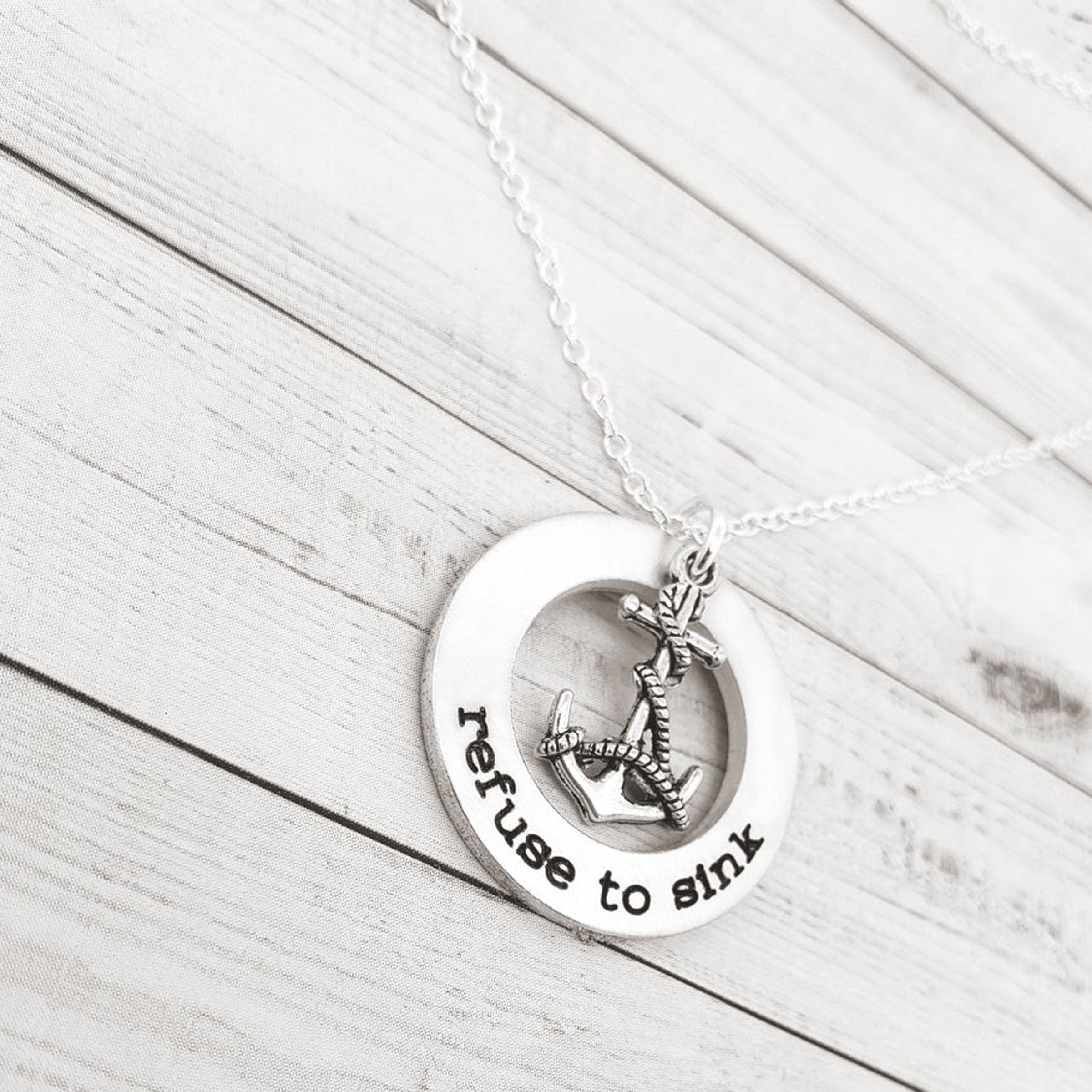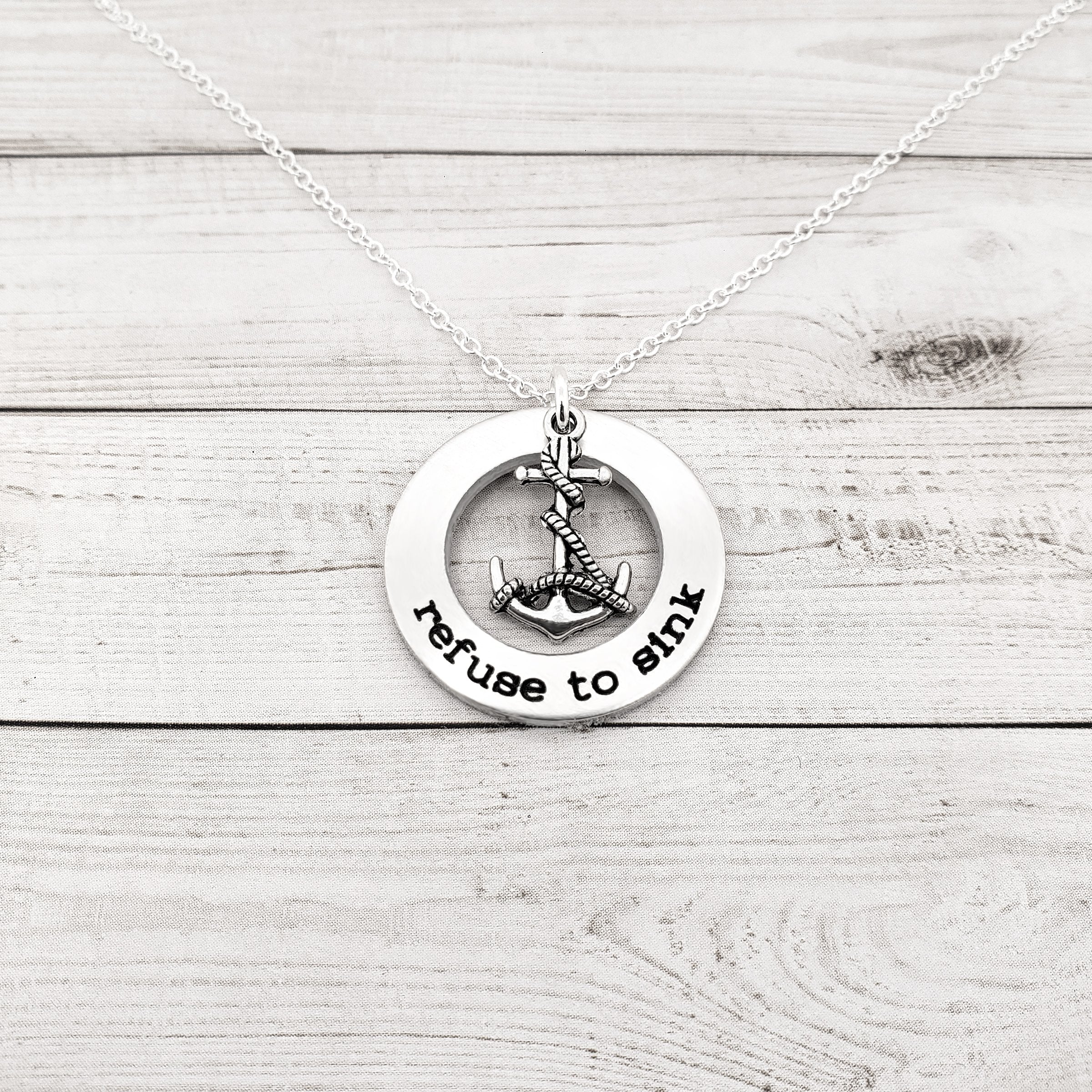 A Refuse to Sink anchor necklace represents internal strength and emotional stability. Some have criticized the I Refuse to Sink necklace for its contradictory elements: the intention of an anchor is to sink. However, in this case, the anchor on a Refuse to Sink necklace symbolizes a person who is in tune with themselves and their emotions, and who remains strong in the face of anxiety and depression. On this washer necklace, the anchor can represent a person who has survived through times of hardship because they refused to be overcome and they acted as an anchor would in the midst of a storm: steady and stable.