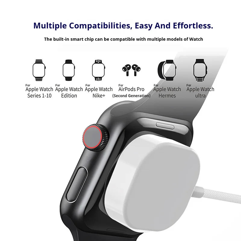 This magnetic wireless fast charger offers universal compatibility across Apple Watch Series 1 through 10, plus Ultra and Hermès models, with bonus support for AirPods Pro. Built with premium materials and engineered for durability, it features short-circuit protection, overcharge safeguards, and wear-resistant construction to ensure long-term reliability. The lightweight, space-saving design makes it ideal for home or travel, while stable current delivery and power-efficient technology minimize energy waste. Safety certifications and plug-and-play functionality mean instant setup with zero hassle. A dependable charging solution that prioritizes both performance and device protection.