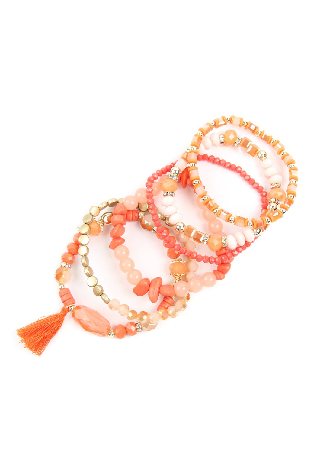 Multi-strand bracelets with a variety of bead styles and colors. Includes natural and turquoise beads, faux pearls in gold-finished settings and dangling charms. These can be worn individually or in different combinations to suit your look.